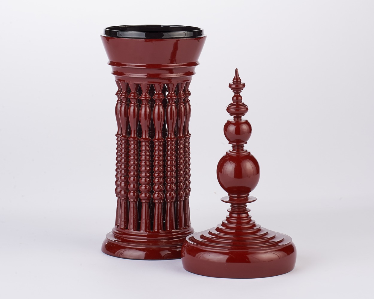 Slight in profile, this delightful variation of a traditional soon-oke holds its own in any décor, as it is uniquely charming. Its spired top removes to reveal a shallow bowl, recalling the soon-oke’s traditional purpose of presenting food to the monastery.