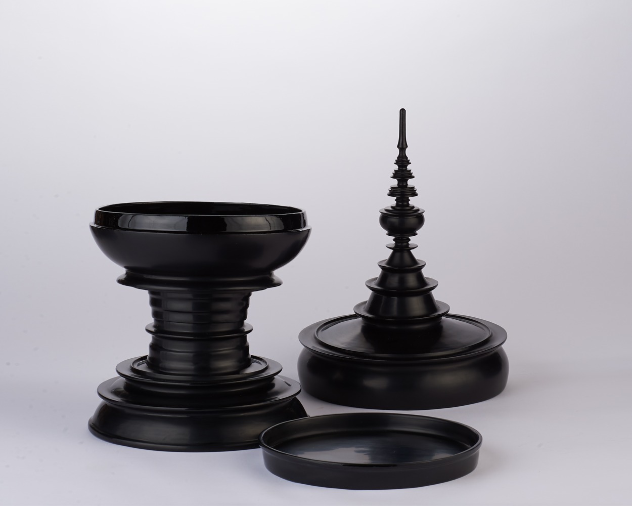Reflecting the shape of the stupa (the top of a pagoda) this traditional vessel is used for presenting food to the monastery. A large bowl set atop a wide circular foot, the top combines graceful curves rising to a spire that reduces in size as it soars. At once exotic and elegant this piece is a sophisticated statement piece, finding a position of distinction on a sofa table, entry table, or shelf.